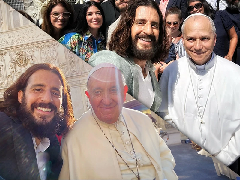À esquerda, Jonathan Roumie com o Papa Francisco em 2022. À direita, Jonathan Roumie com o Papa Leão XIV. Fotos: Instagram do @jonathanroumieofficial
