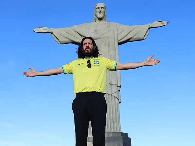 Jonathan Roumie no Cristo Redentor em 2024, durante a promoção da Quarta Temporada de The Chosen. Imagem: Instagram @thechosentvbr